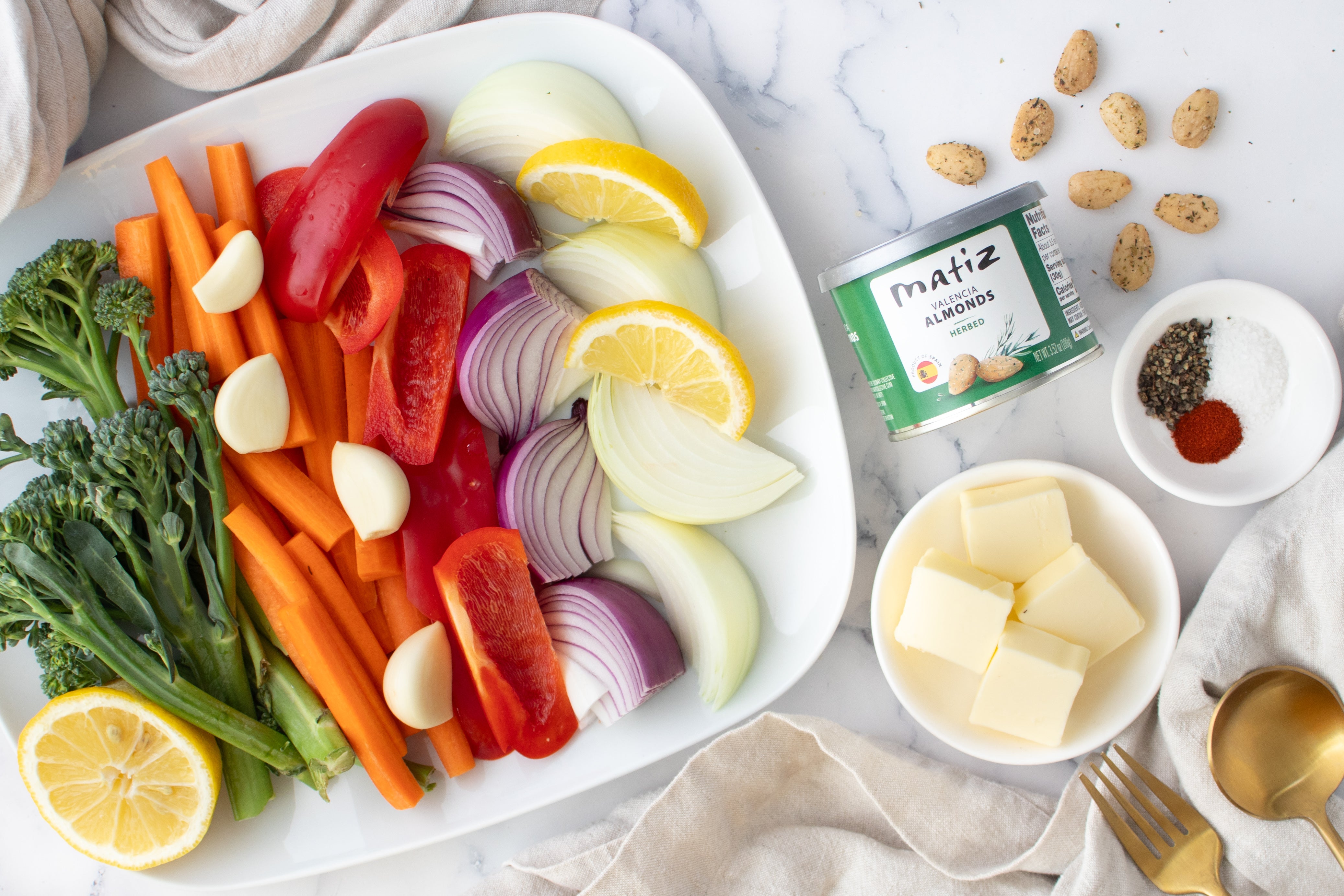 We love these Roasted Vegetables with Herbed Almonds, a versatile side dish ideal for any meal. Our secret ingredient and a clever way to impart herbaceous flavor without an excessive ingredient list...Matiz Valencia Almonds with Herbs! These tasty Spanish almonds are seasoned with rosemary, oregano, and sea salt and, while roasting, infusing the veggies with those herby elements.