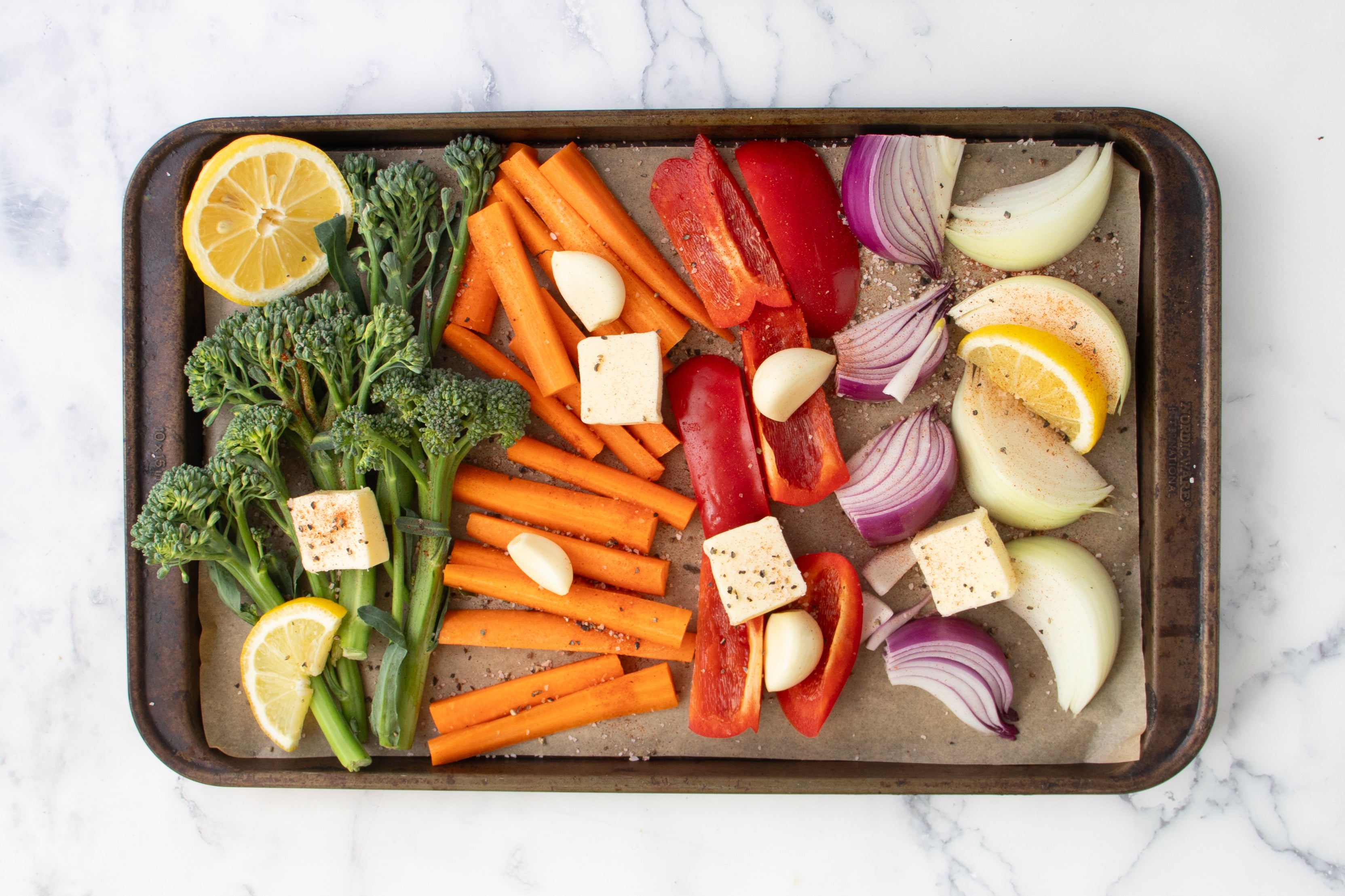 2. Place the broccolini, carrots, bell pepper, onion, garlic, and lemon on the prepared baking sheet. Top the veggies with butter and season with salt, pepper, and paprika.