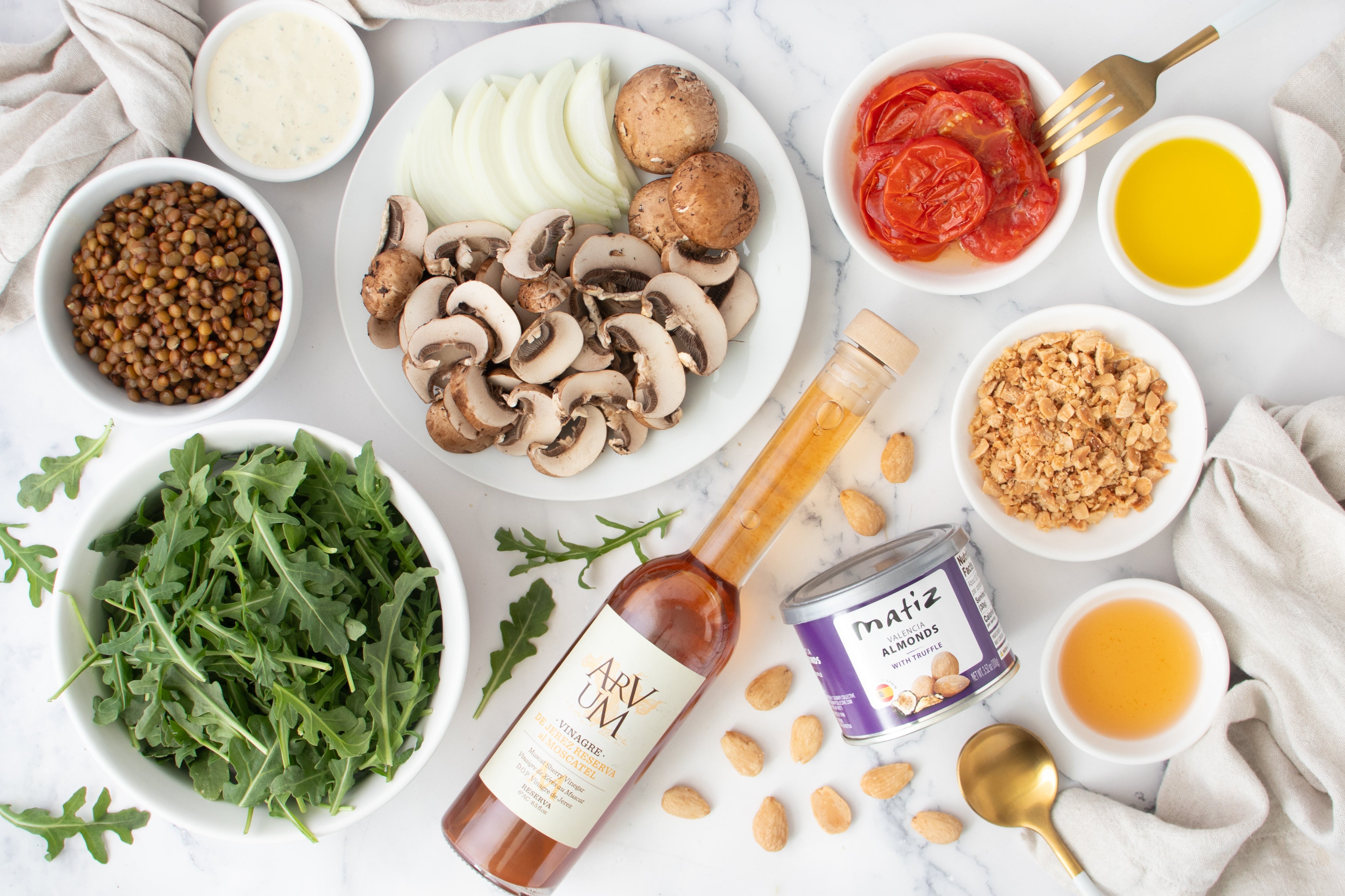 This simple Warm Mushroom & Truffle Almond Salad is fully loaded with hale, hearty, sweet, and savory ingredients–well balanced and well rounded. The mushrooms and onions are roasted in a combination of olive oil and Arvum Moscatel Sherry Vinegar. The salad is sprinkled with crushed truffle-infused Matiz Valencia Almonds, for an earthy-salty finish.