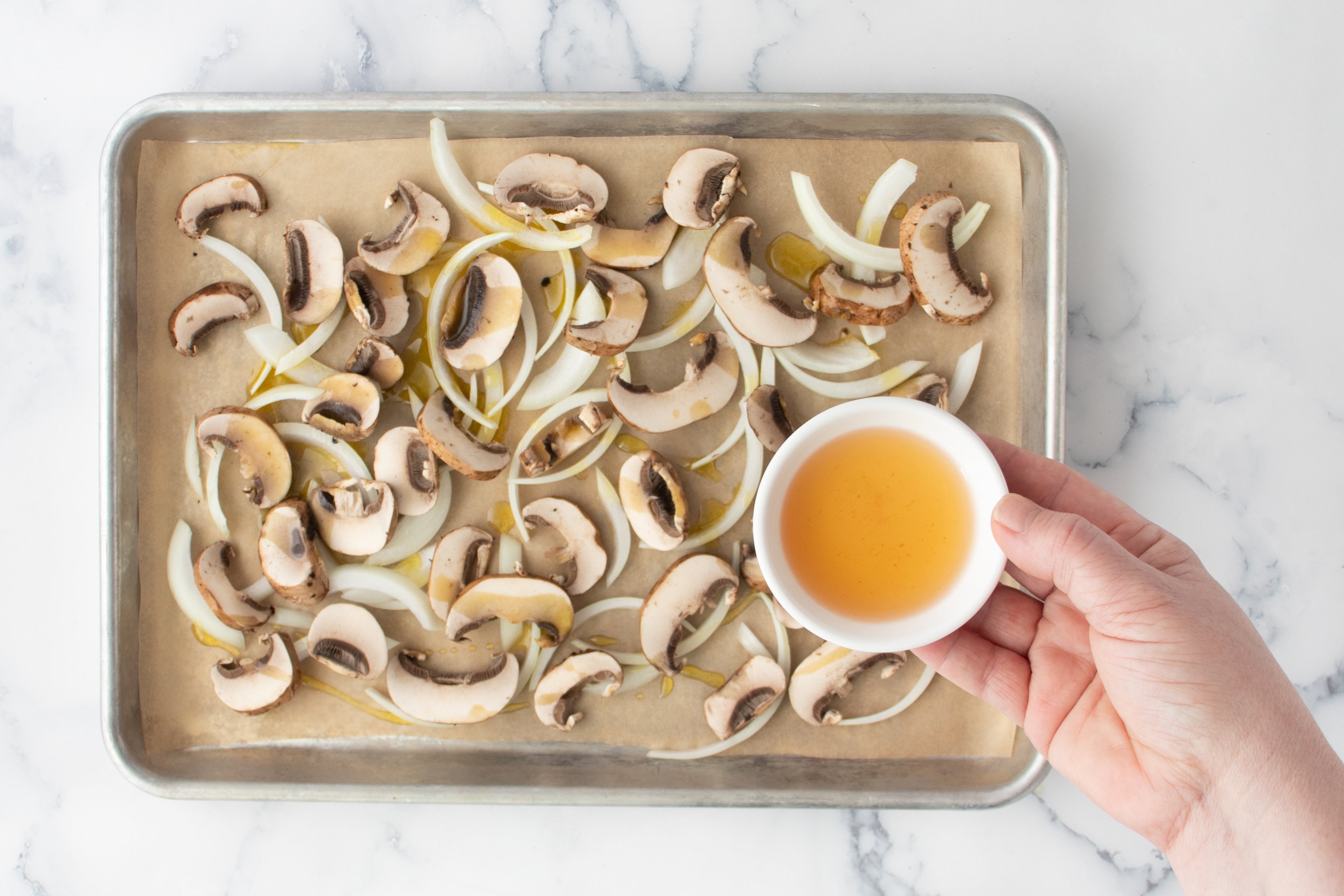 1. Preheat the oven to 400°F and line a large baking sheet with parchment paper. Spread mushrooms and onions out in an even layer and drizzle with olive oil and vinegar.