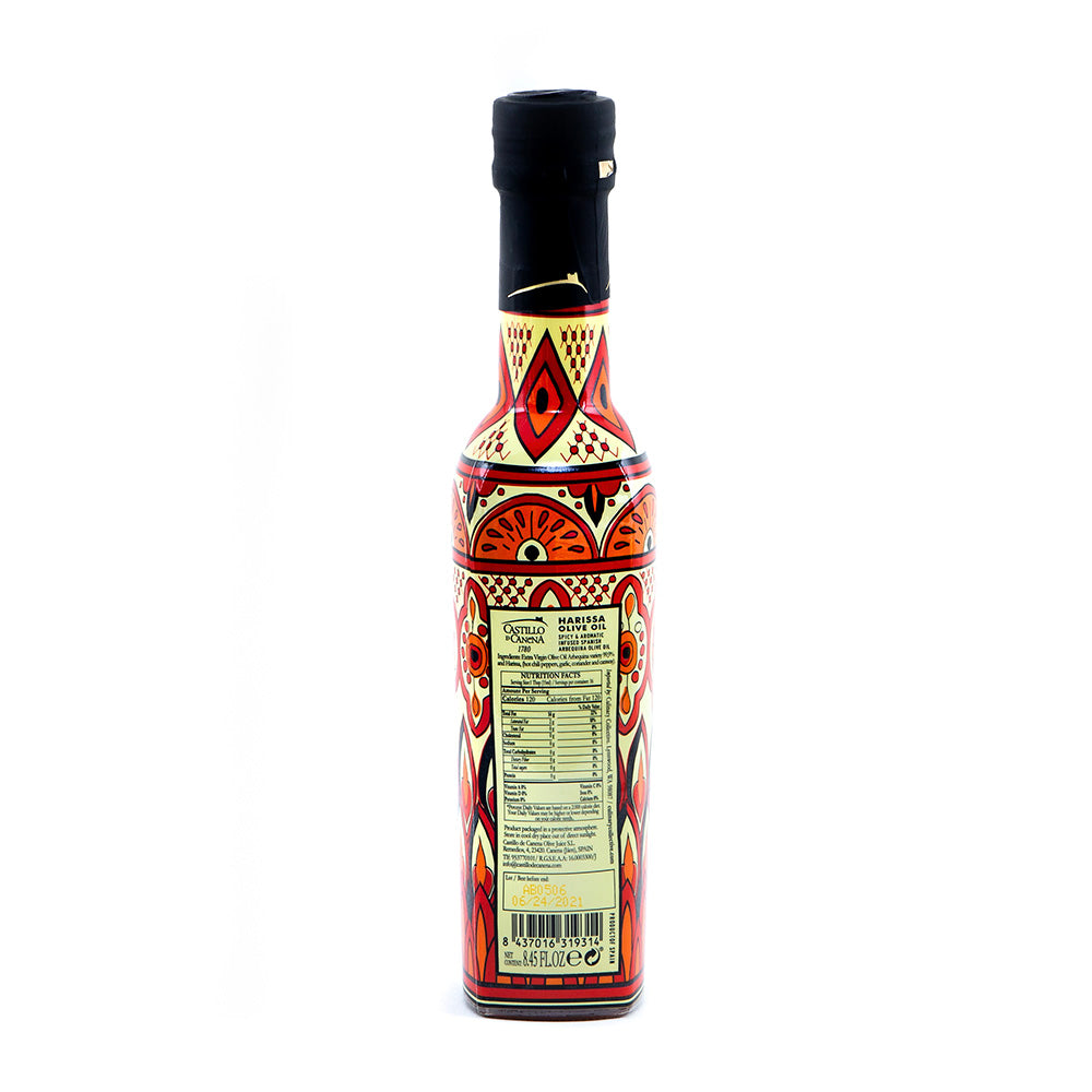 Award-winning, high-quality Arbequina olive oil infused with spicy and aromatic Harissa spices. Produced in Andalusia's Guadalquivir Valley since 1780, this fragrant red-hued oil combines Castillo de Canena extra virgin olive oil with hot chili peppers, garlic, coriander, and caraway. Perfect for finishing fish, pork, chicken, vegetables, or drizzling over hummus and dips!