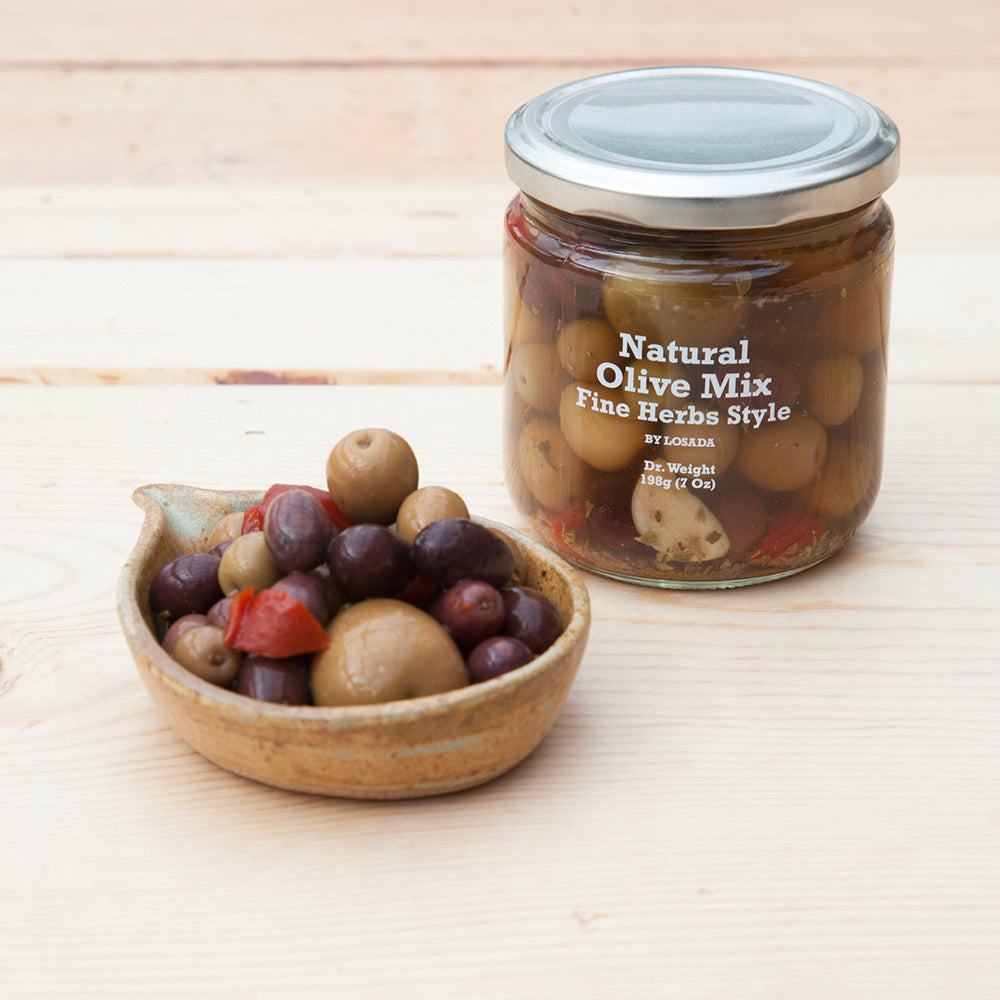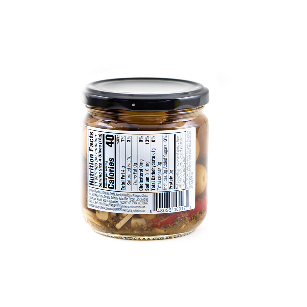 The perfect savory combination of Spanish hojiblanca, gordal, cuquillo, and arbequina olives, combined with natural herbs and red pepper. Naturally cured with just water and salt, these hand-harvested Spanish olives offer a rich, flavorful taste.