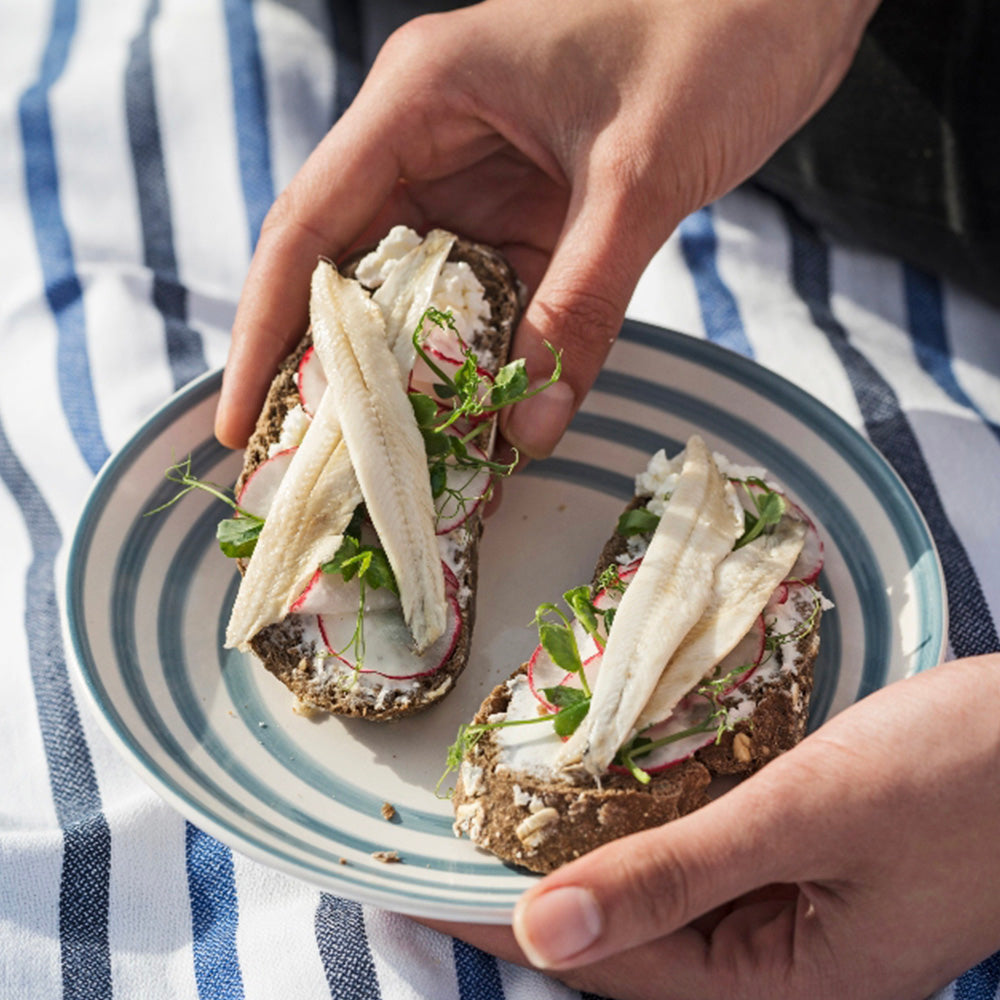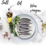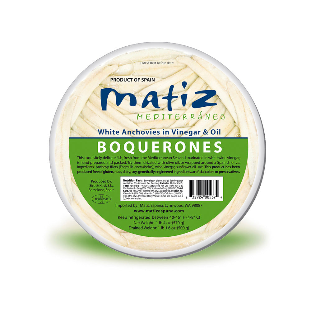 Fresh-marinated white anchovies from Spain, refrigerated to maintain their delicate texture and briny flavor. Plump and succulent, these anchovies are perfect on their own with a drizzle of olive oil or served with salads or fresh tomato on bread!