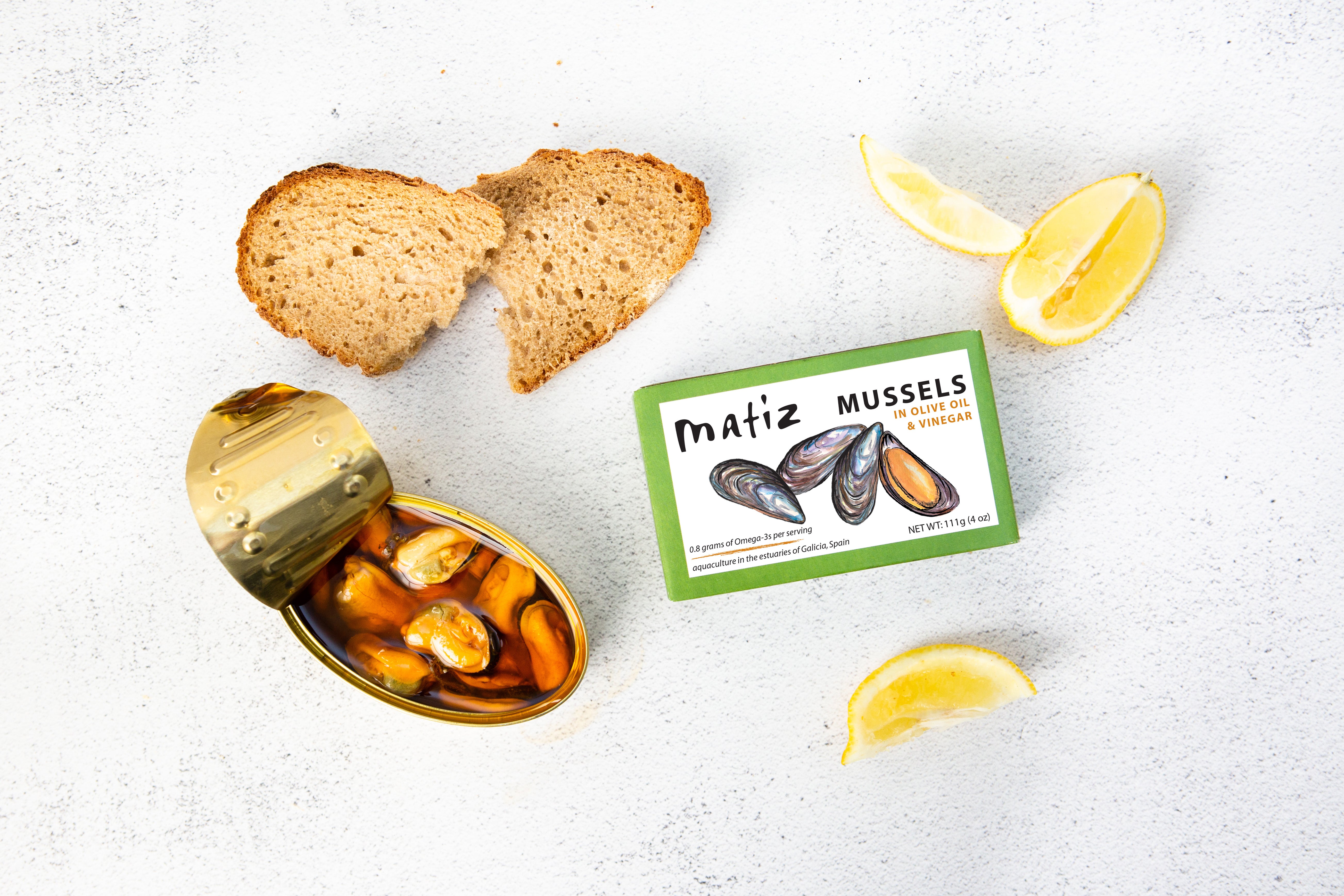 Delicious, tender, mussels from the wild coast of Galicia in Spain. Hand-packed in a marinade with olive oil, vinegar and spices, enjoy these mussels fresh from the tin, sauteed with onions, or serve with pasta sauce and bread!