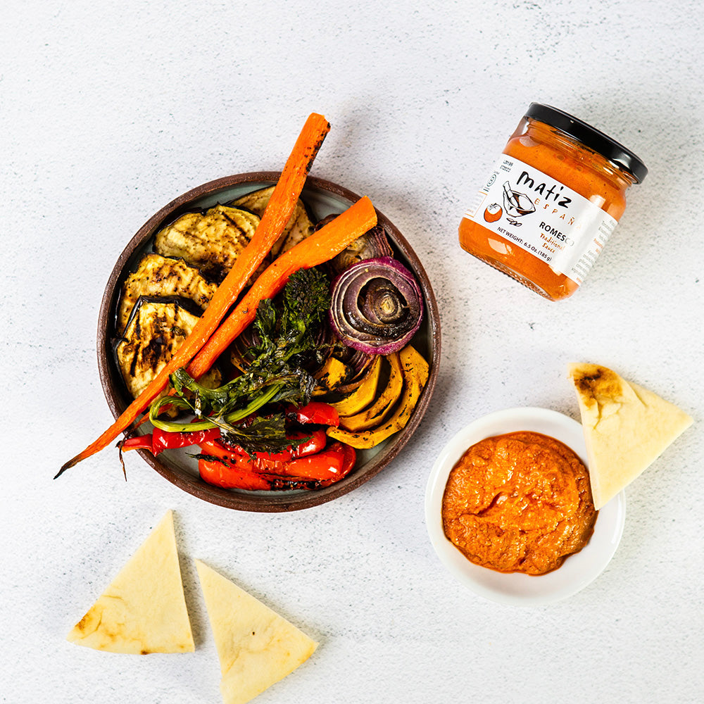 A traditional Spanish sauce made from tomatoes and ground almonds. Made in Barcelona using traditional recipes and fresh, organic Mediterranean ingredients, this sauce is perfect for dipping grilled veggies, served with fish, or fried eggs.