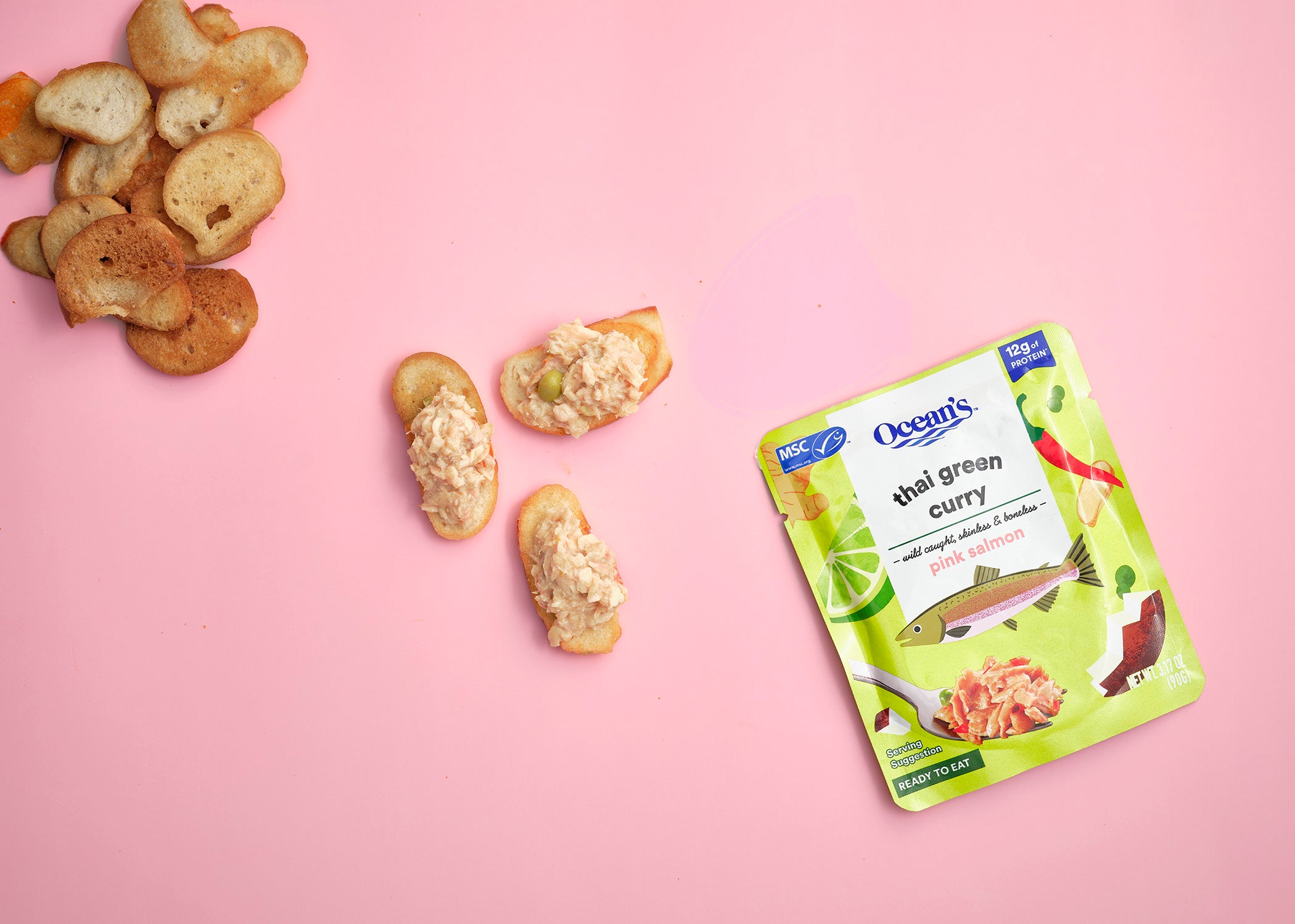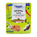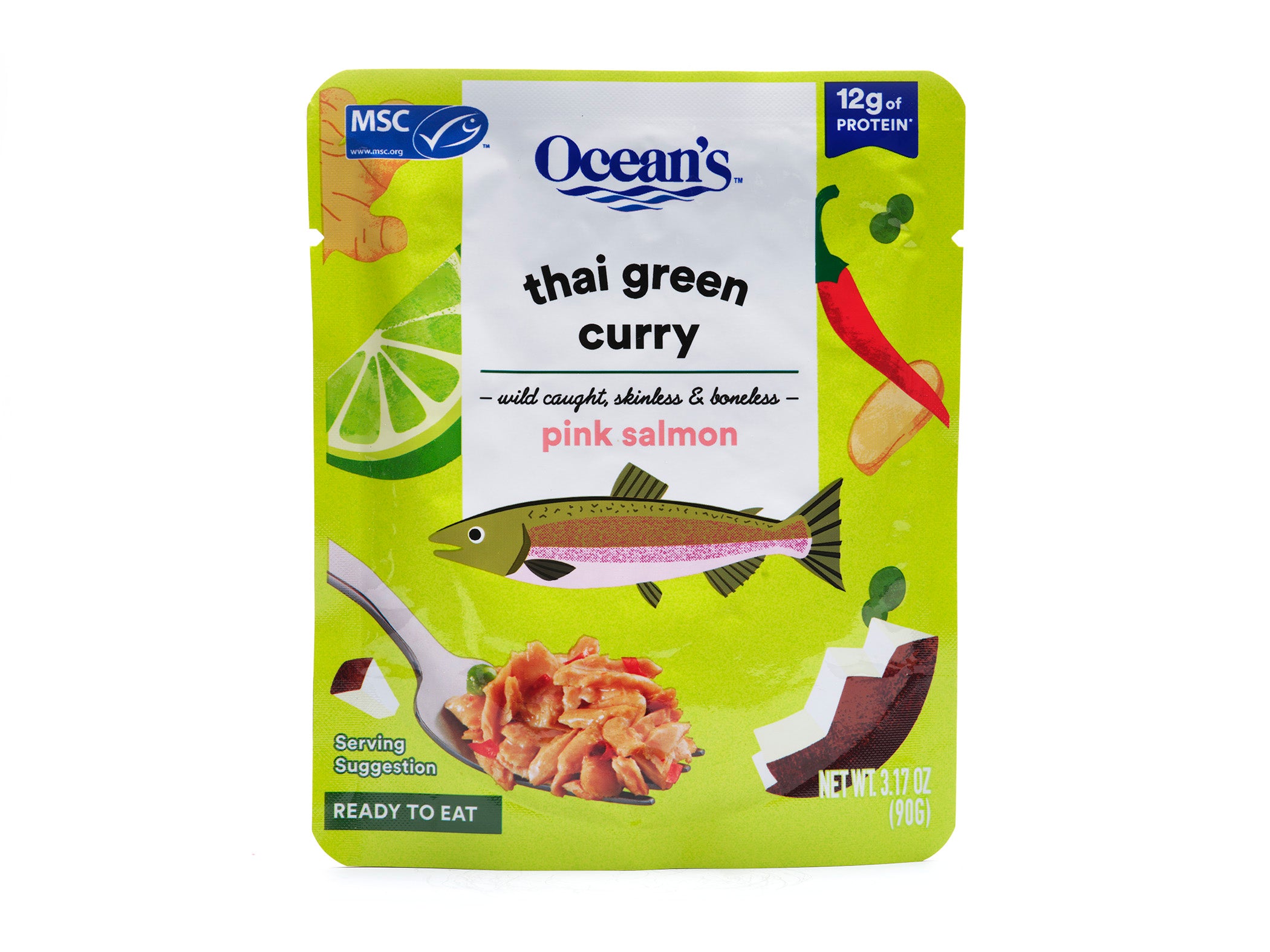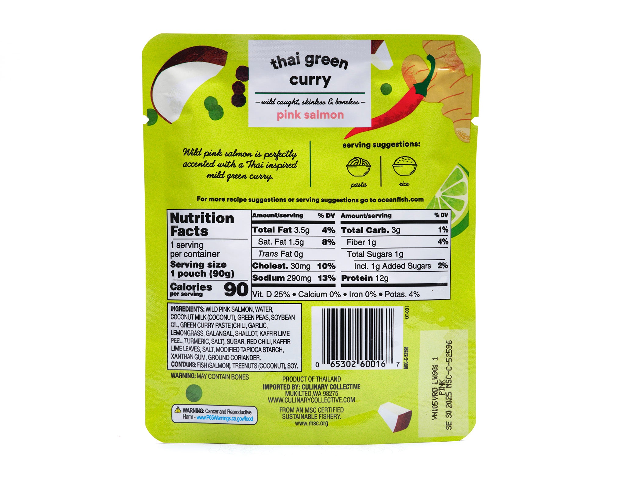 Ready to eat MSC certified Sustainable Wild Pink Salmon and green curry paste combined with coconut milk, results in a harmonious blend of spicy, sweet, creamy, and herbal flavors. Perfect for an on-the-go, high-protein snack!
